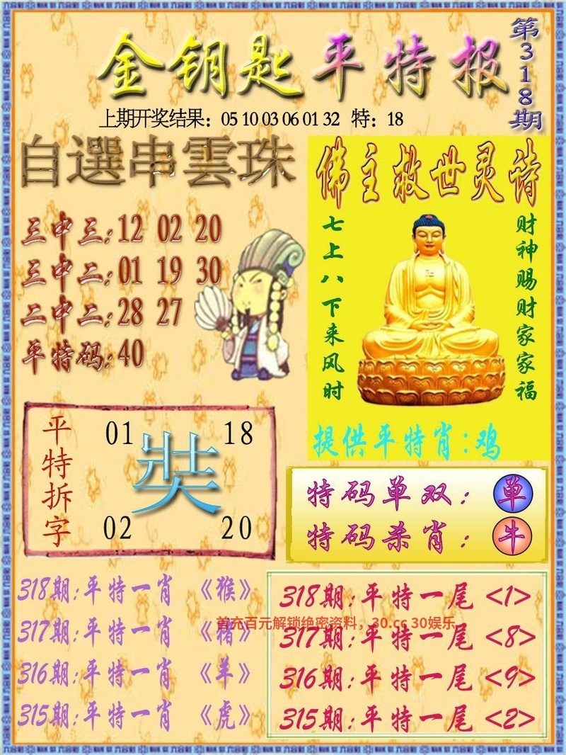 316期一字記曰:【渴】 生命之源,不能缺莫,力争一瓢求解渴 求生本能,一定准确,象床玉手出新奇 《瑞》 解:沙恨无金尽日淘:尽日淘解日肖蛇马兔龙羊猴 综合取肖:蛇马兔龙羊猴 |